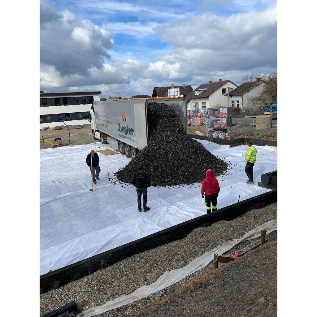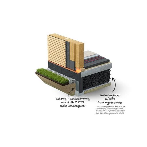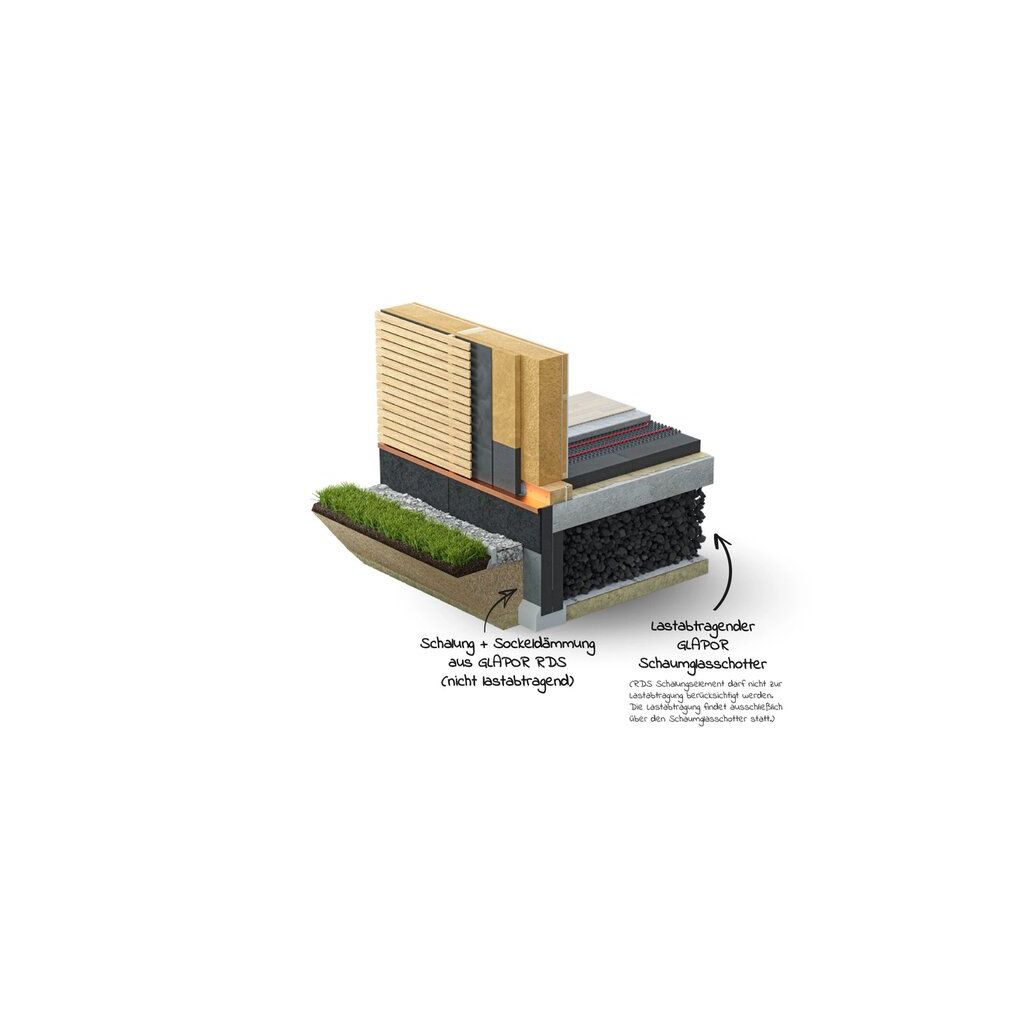 Das GLAPOR RDS Kombi-Perimeterdämmsystem verbindet die Eigenschaften von Schaumglasplatten und Schaumglasplatten zu einem kunststofffreien, rückbaufähigen, zirkulären Dämmsystem für lastabtragende Bodenplatten, welches in dieser Art weltweit einzigartig ist. Bekannte XPS-Dämmstoffe können hiermit problemlos ersetzt werden und CO2 Bilanzen für klimaneutrale Bauweisen optimiert werden. Zudem entfallen alle Holz-Schalungsarbeiten und das Dämmen der Bodenplattenstirnseite ist nachträglich nciht mehr nötig. Die lastabtragende Funktion wird hierbei vom GLAPOR Schaumglasschotter übernommen- die GLAPOR RDS Elemente dienen als Schalung und Stirnseitendämmung - Schnell. Einfach. Ökologisch. - Ganz ohne Kunststoff!DIBt zugelassenes Kombi-Perimetersystem: kunststofffrei, nicht-brennbar, wasserdicht (Korn und Platte), extrem druckfest, aus 100% Recyclingglas hergestellt, nagetierbeständig, besonders zirkulärer Dämmstoff, Urban Mining ready, wiederverwendbar - Korngröße 32-63 mm - Lieferbar in Bigbags (1,5 und 3 kbm) odr Containern (90 kbm)