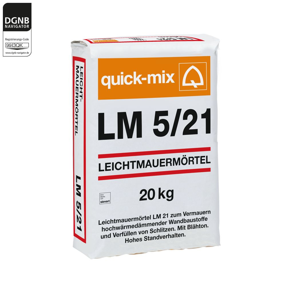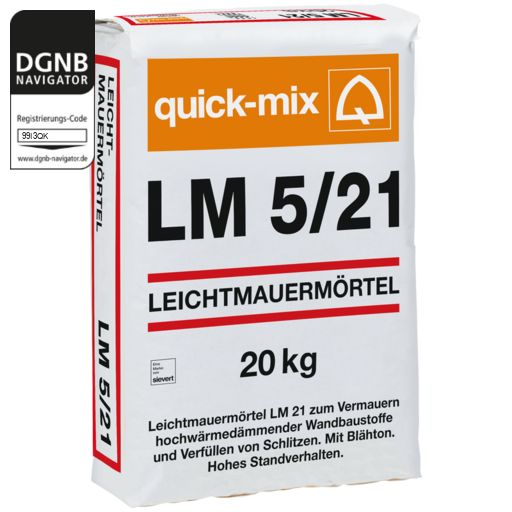 quick-mix LM 5/21 ist ein mineralischer Leichtmauermörtel mit Blähton zum Vermauern von hochwärmedämmenden Eigenschaften mit einer Druckfestigkeit von 5 N/mm². Das kg CO2-Äquivalent pro m² ist durch seine hohe Ergiebigkeit im Gegensatz zu herkömmlichen Mauermörteln deutlich reduziert.Bezug zum DGNB System